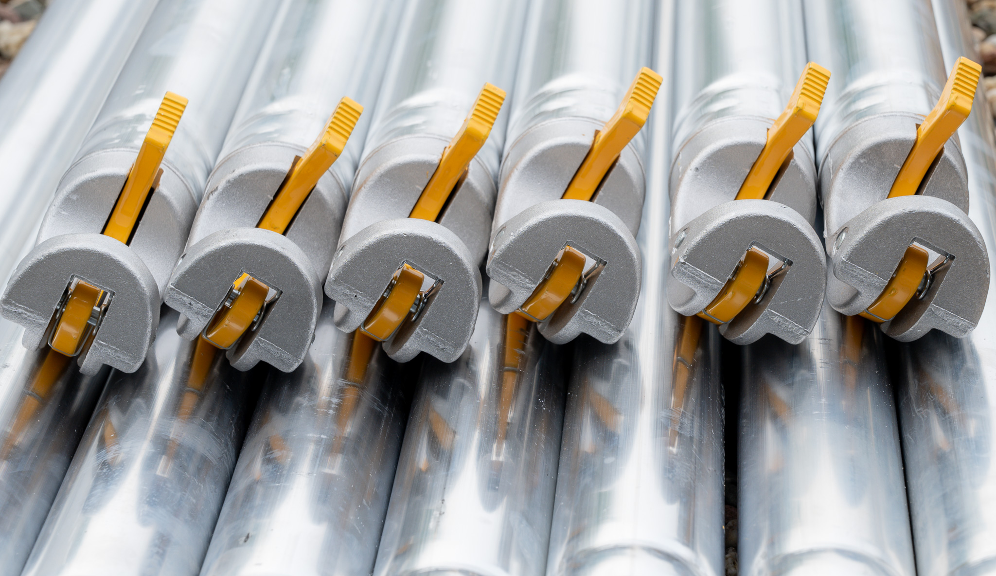 De pallen van een horizontaalschoor zijn in geel uitgevoerd en de pallen van een diagonaalschoor is in zwartgroen uitgevoerd, zodat de horizontale en diagonale schoren eenvoudig te onderscheiden zijn. De schoor heeft een diameter van 5 cm x 5 cm en heeft een geperste verbinding met de klauw voor een gegarandeerd lange levensduur