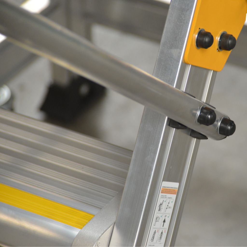 De beugel op de eerste trede herinnert je er aan als het platform ongeremd is. Wanneer het platform geremd is, klapt deze omhoog en kun je het platform betreden.