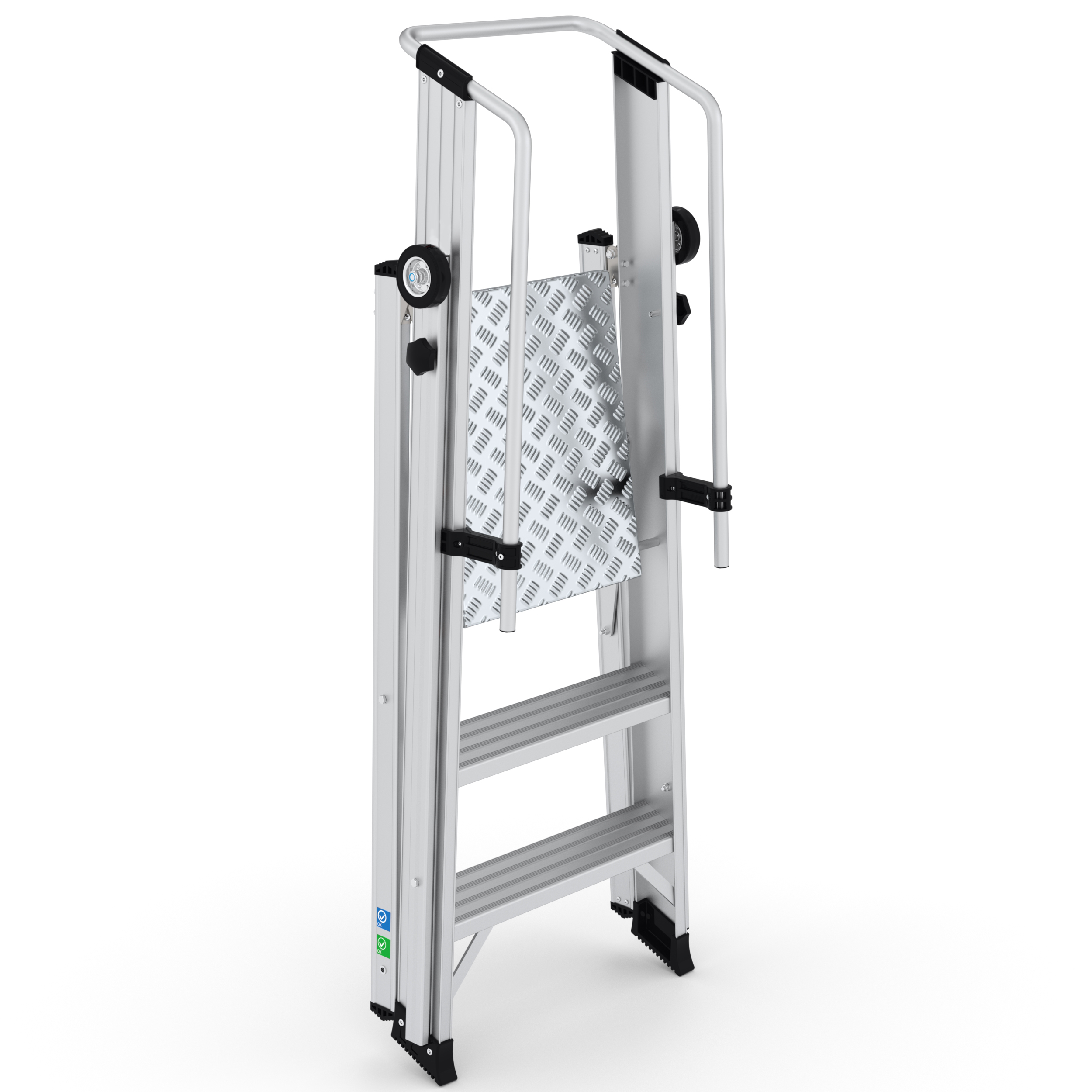 Dankzij de leuning beklim kun je het platform comfortabel beklimmen. De platformtrap heeft 3 treden (inclusief platform) en heeft een werkhoogte van 2,75 meter