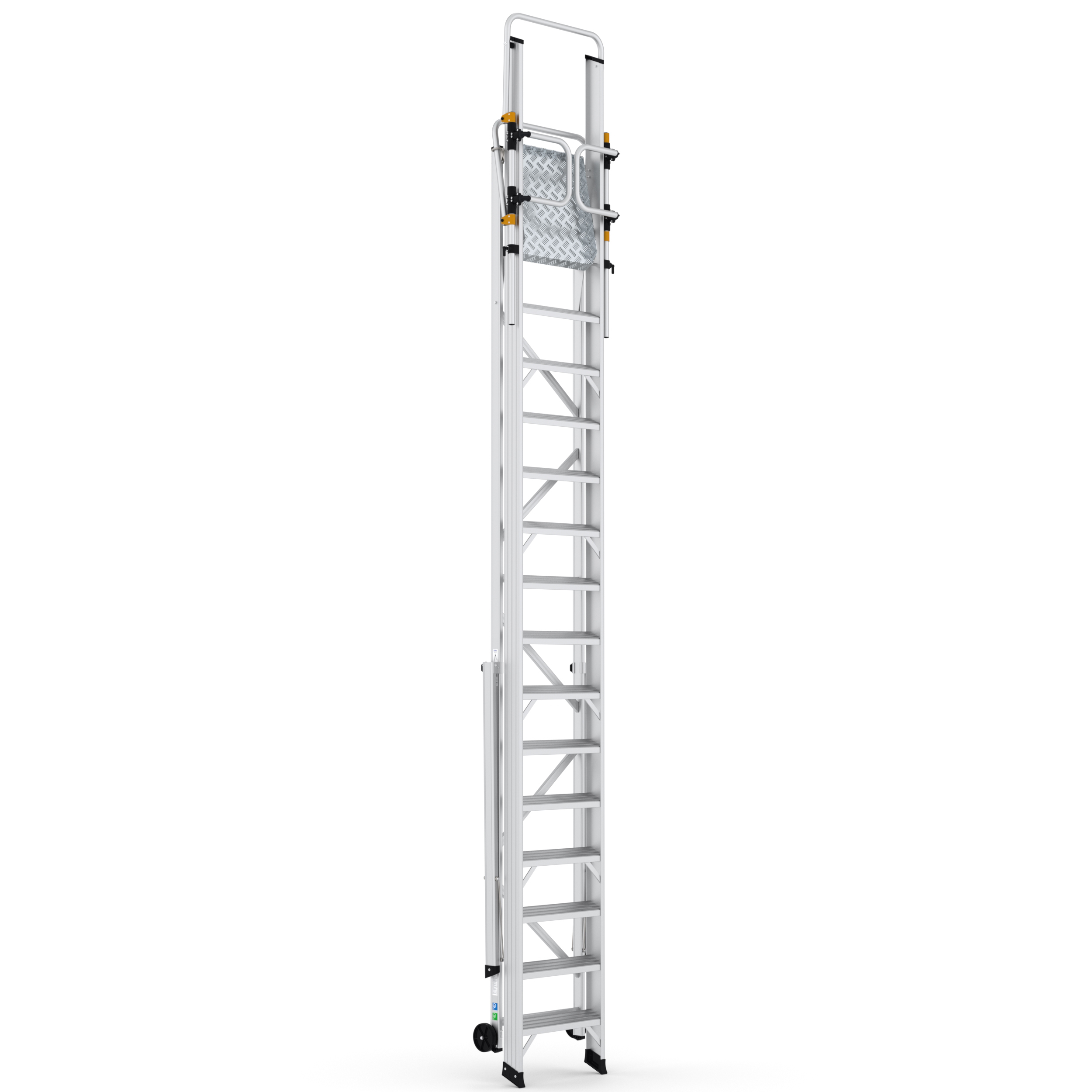 Dankzij de terugverende deuren ben je rondom voorzien van een leuningwerk. De platformtrap heeft 15 treden (inclusief platform) en heeft een werkhoogte van 5,75 meter.