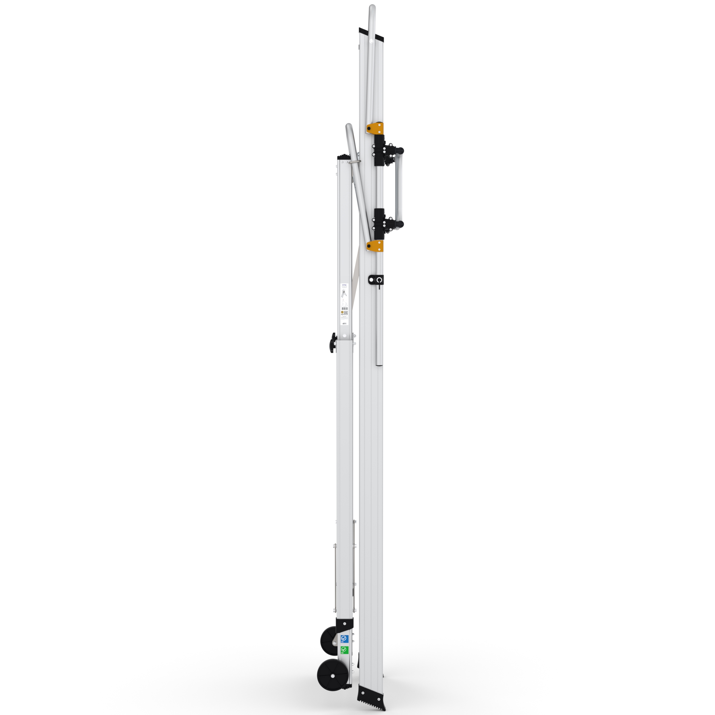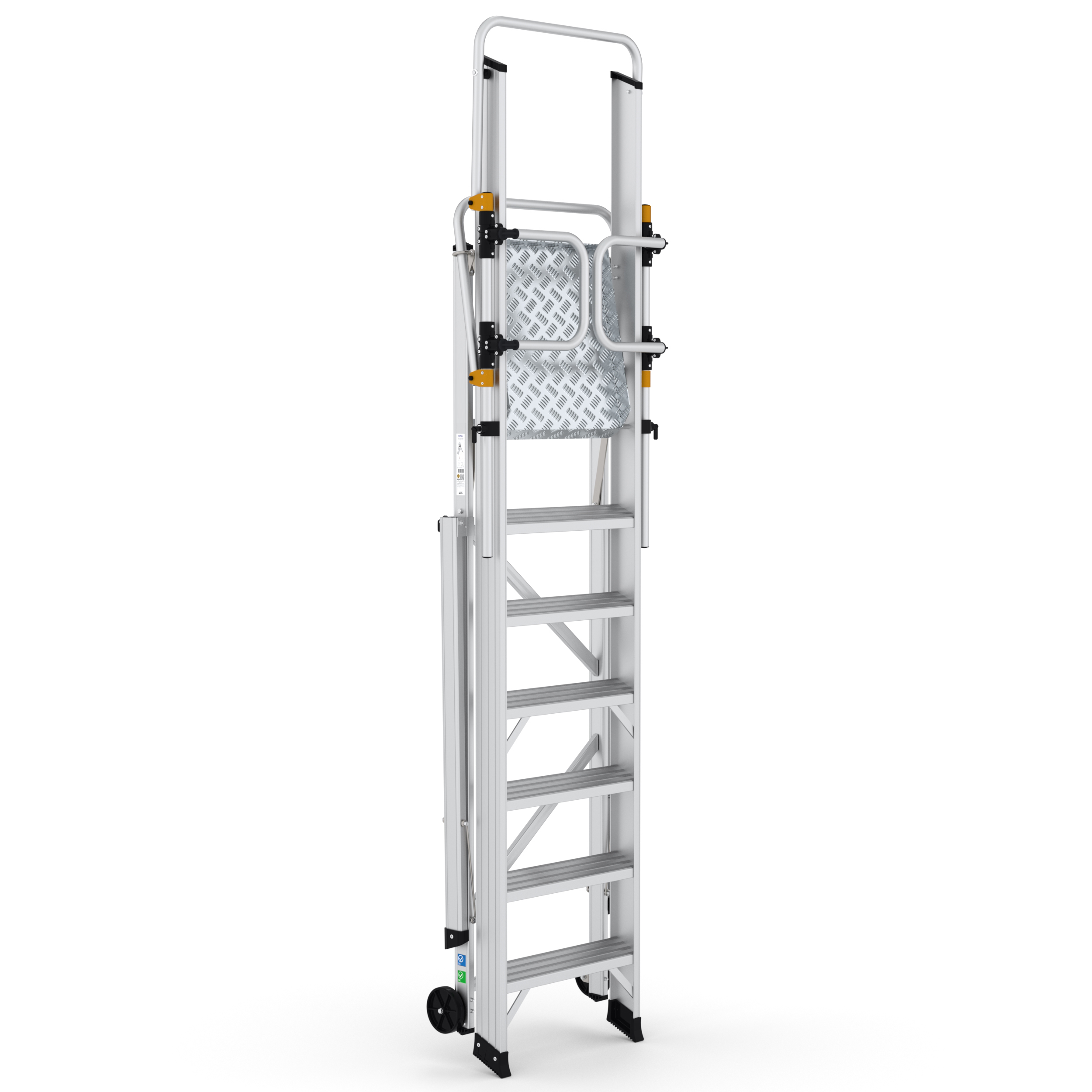 Dankzij de terugverende deuren ben je rondom voorzien van een leuningwerk. De platformtrap heeft 7 treden (inclusief platform) en heeft een werkhoogte van 3.75 meter.