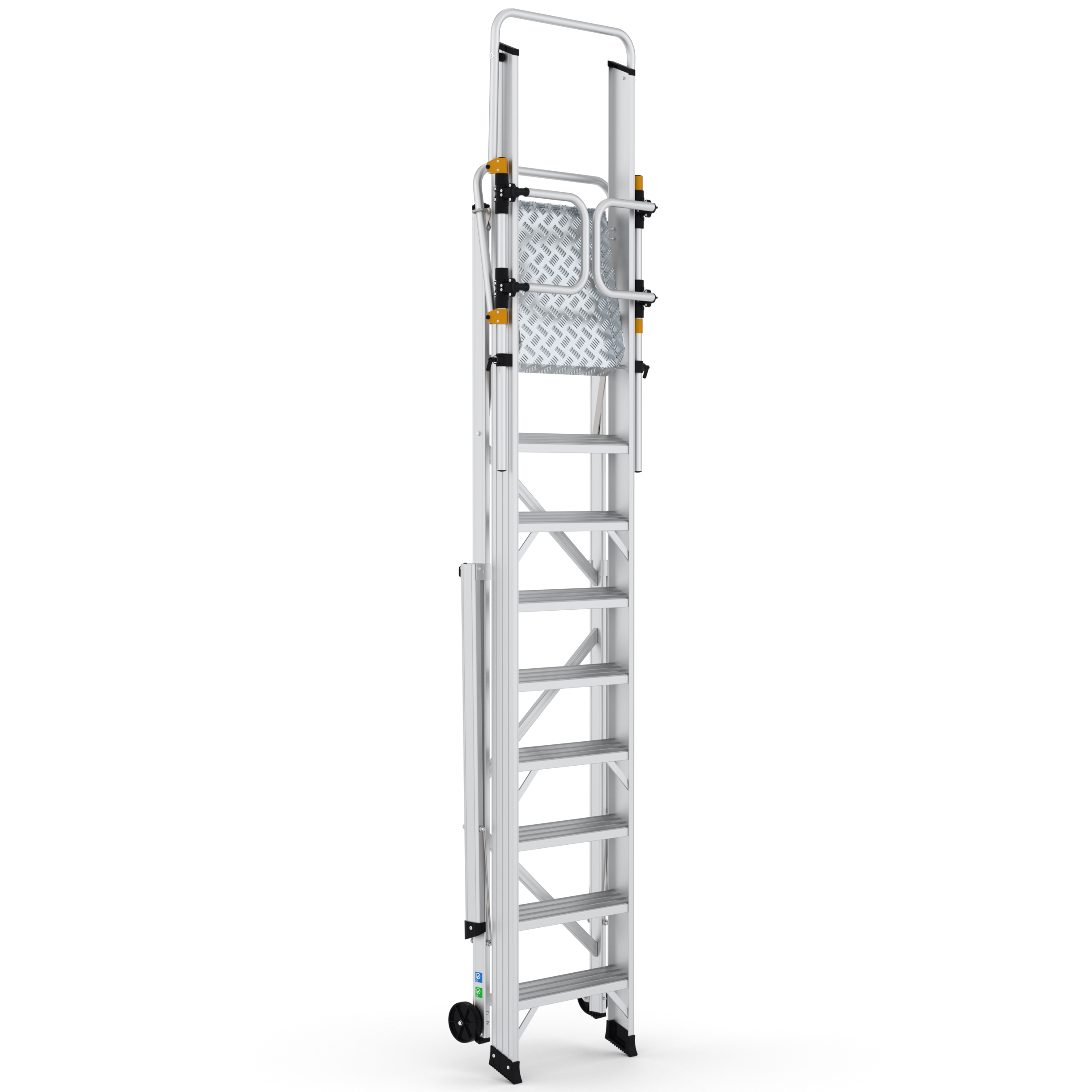 Dankzij de terugverende deuren ben je rondom voorzien van een leuningwerk. De platformtrap heeft 9 treden (inclusief platform) en heeft een werkhoogte van 4,25 meter.