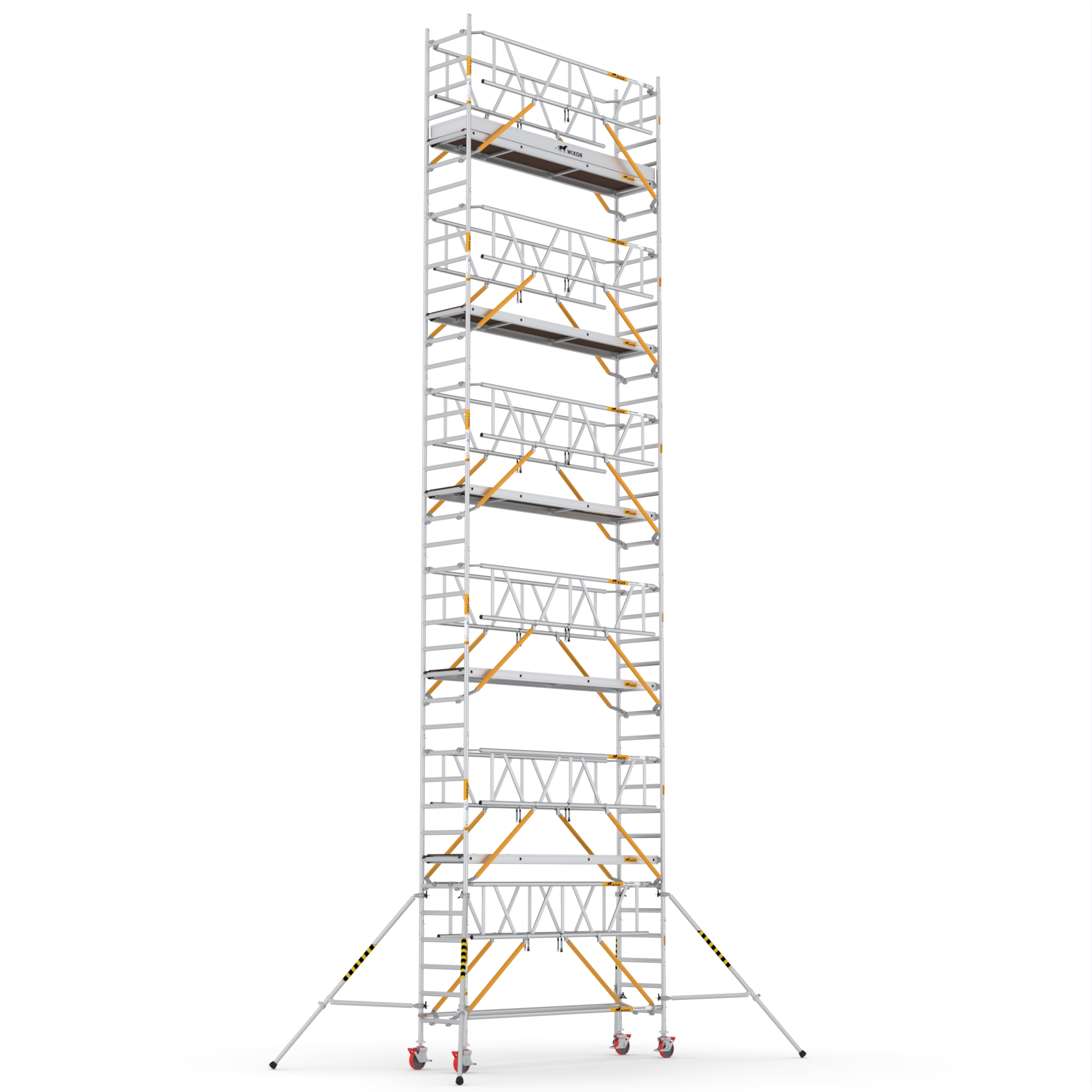 De breedte van deze rolsteiger is 135cm en het werkplatform is voorzien van twee platformen van 60cm breed.
