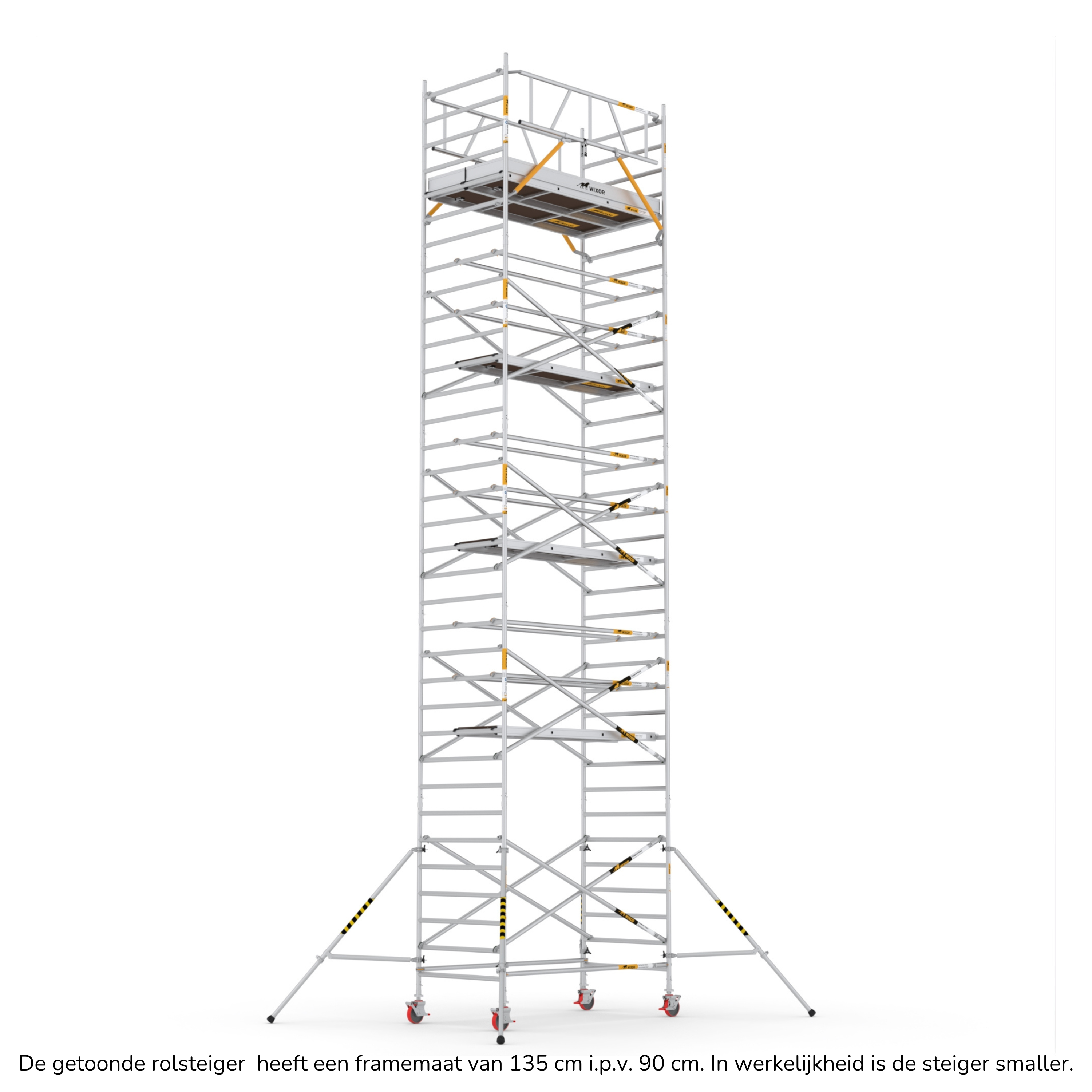 De breedte van deze rolsteiger is 135cm en het werkplatform is voorzien van twee platformen van 60cm breed.