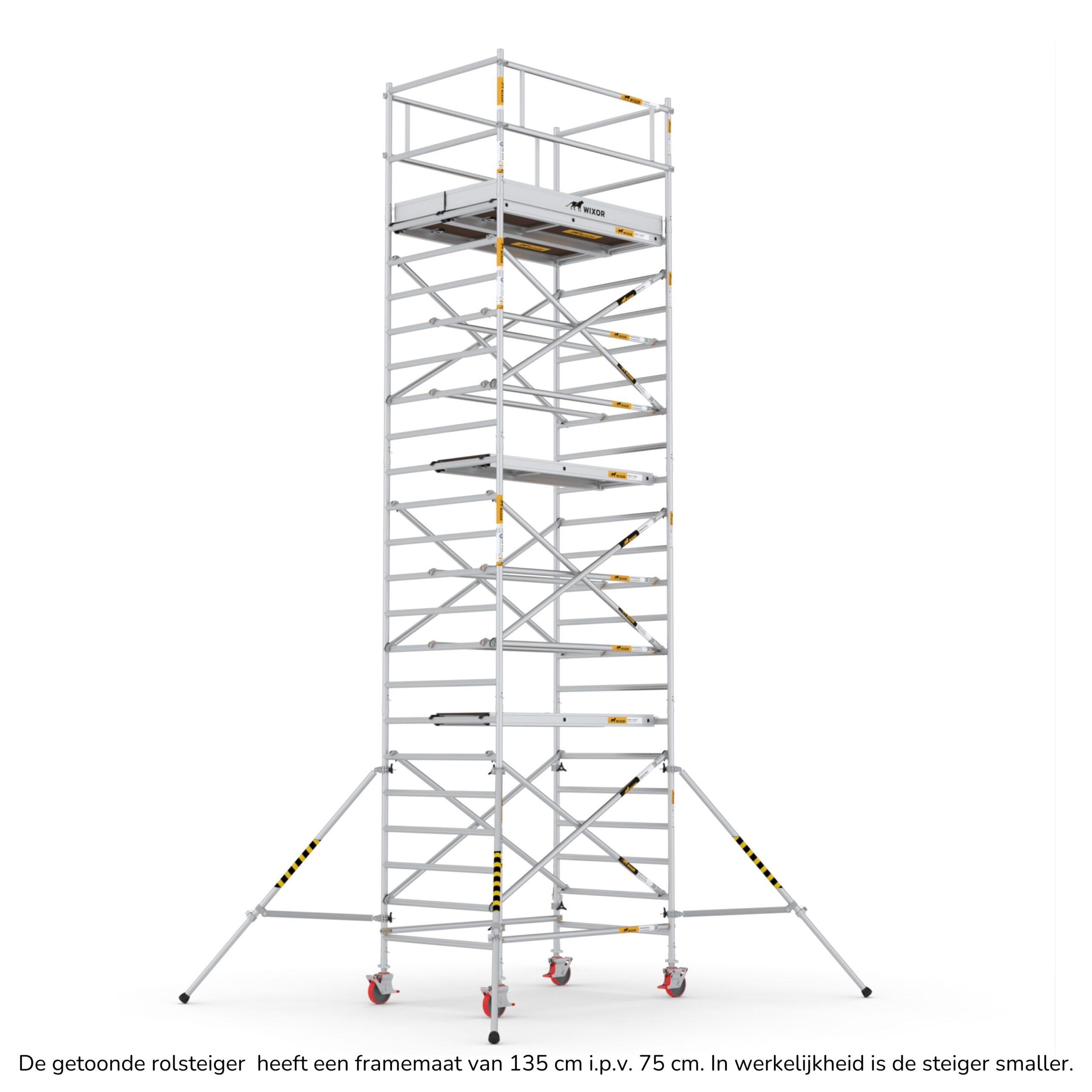 De breedte van deze rolsteiger is 75cm en het werkplatform is voorzien van één platform van 60cm breed, wat ideaal is voor gebruik in smalle ruimtes.