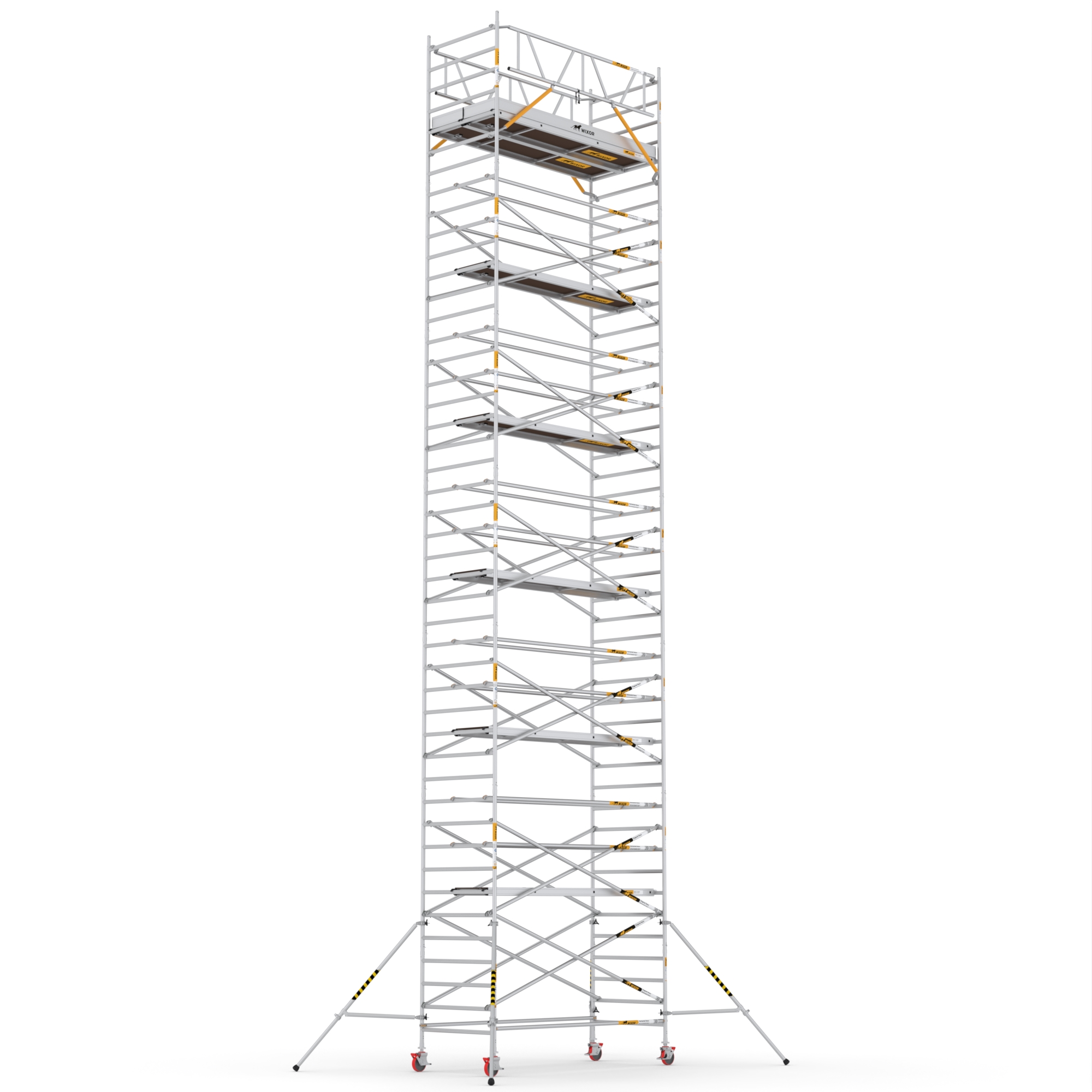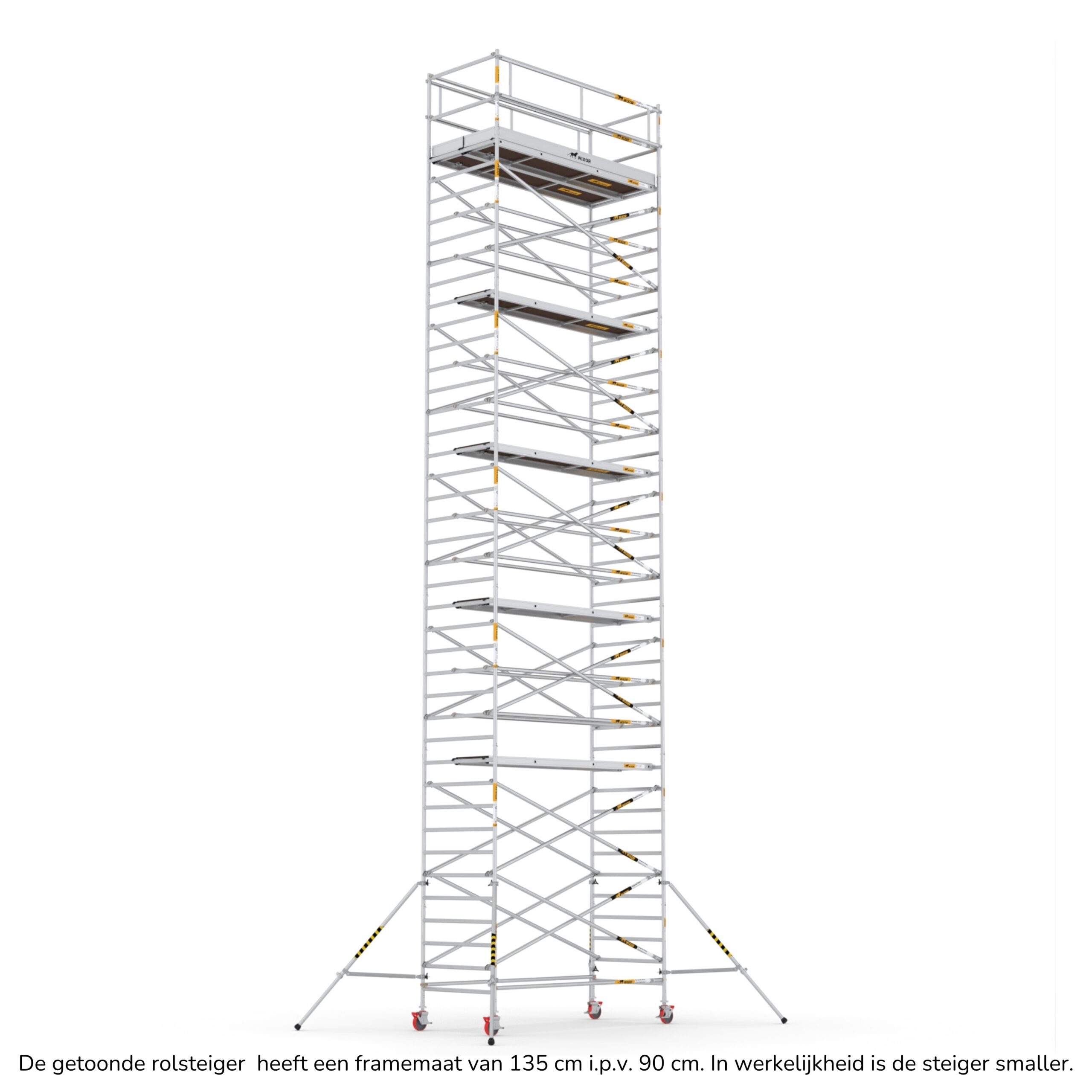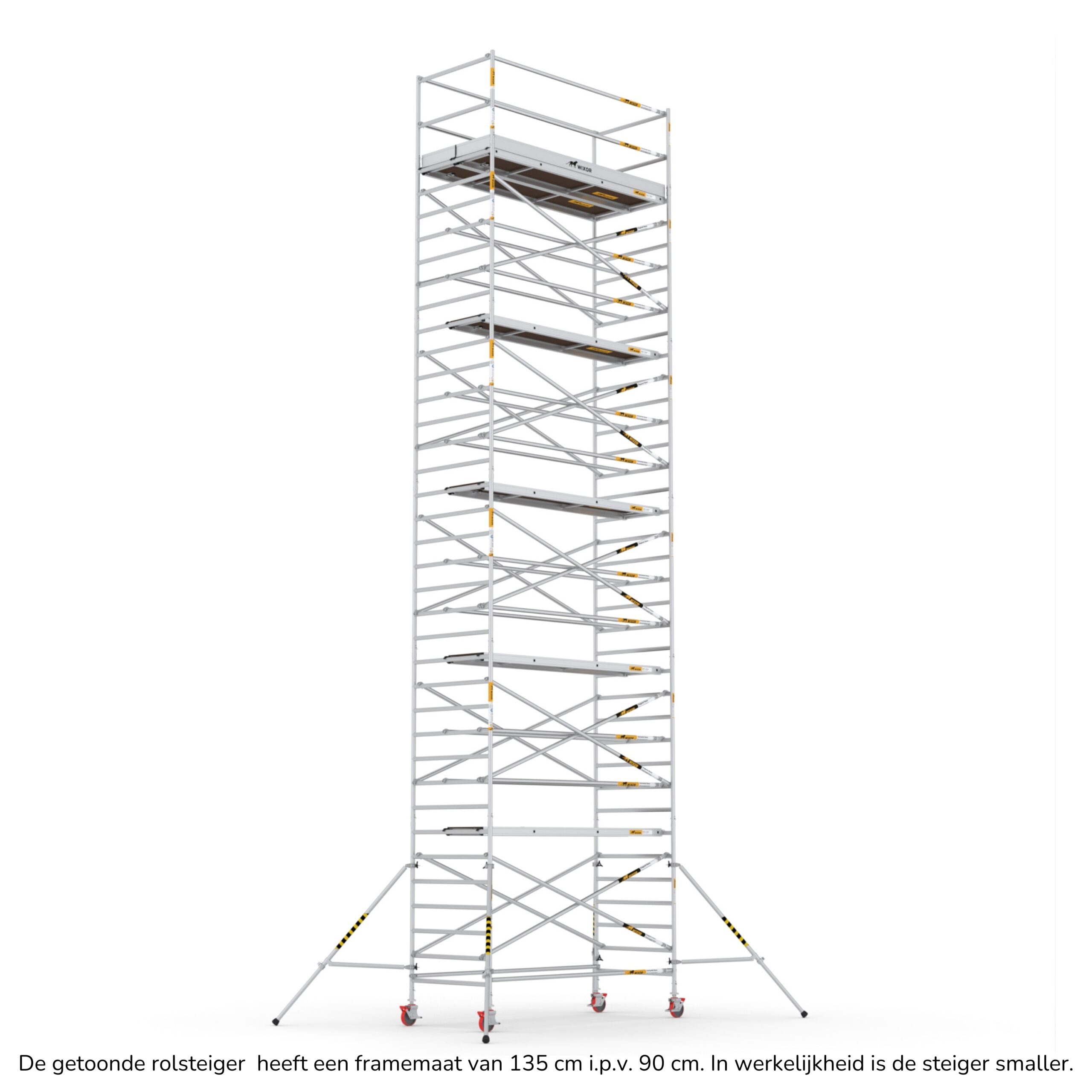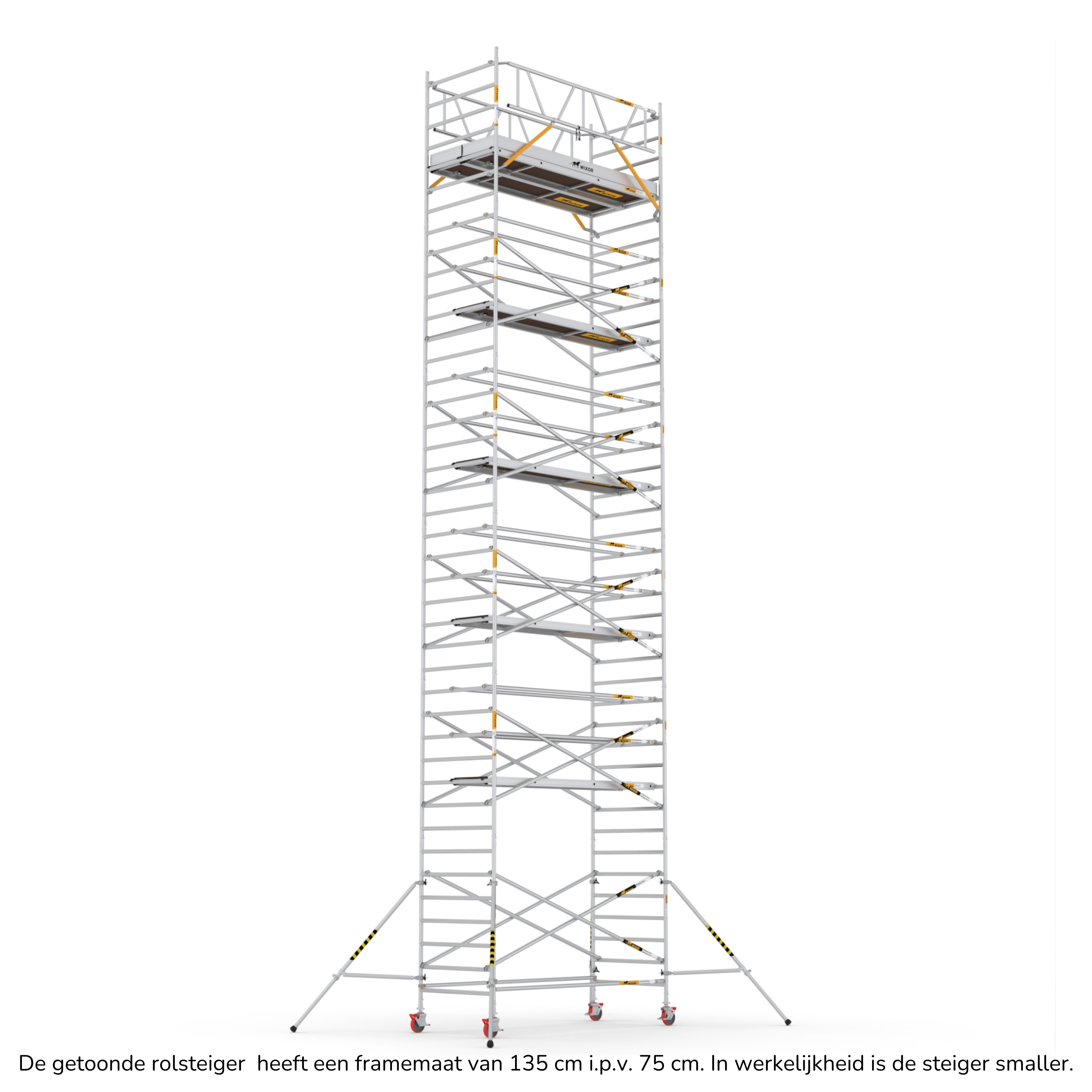 De breedte van deze rolsteiger is 75cm en het werkplatform is voorzien van één platform van 60cm breed, wat ideaal is voor gebruik in smalle ruimtes.