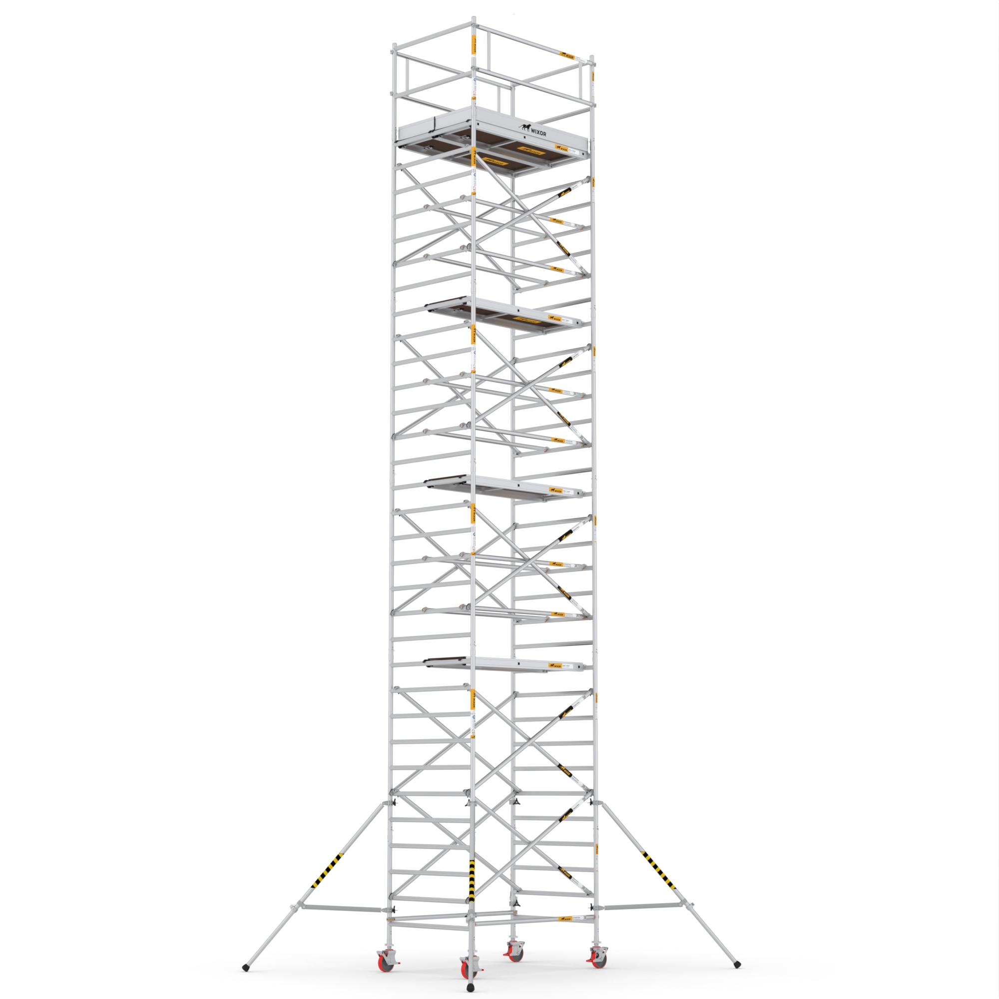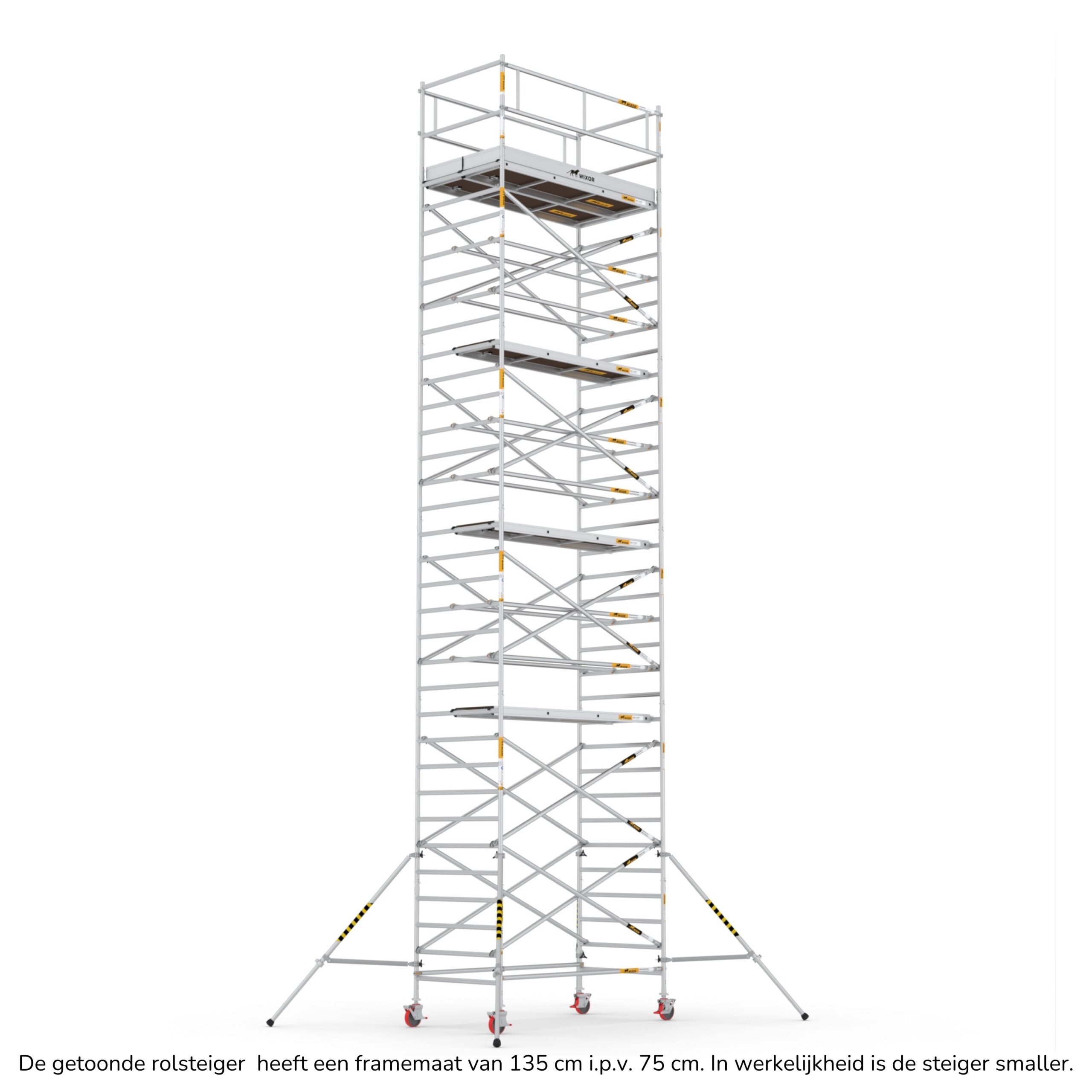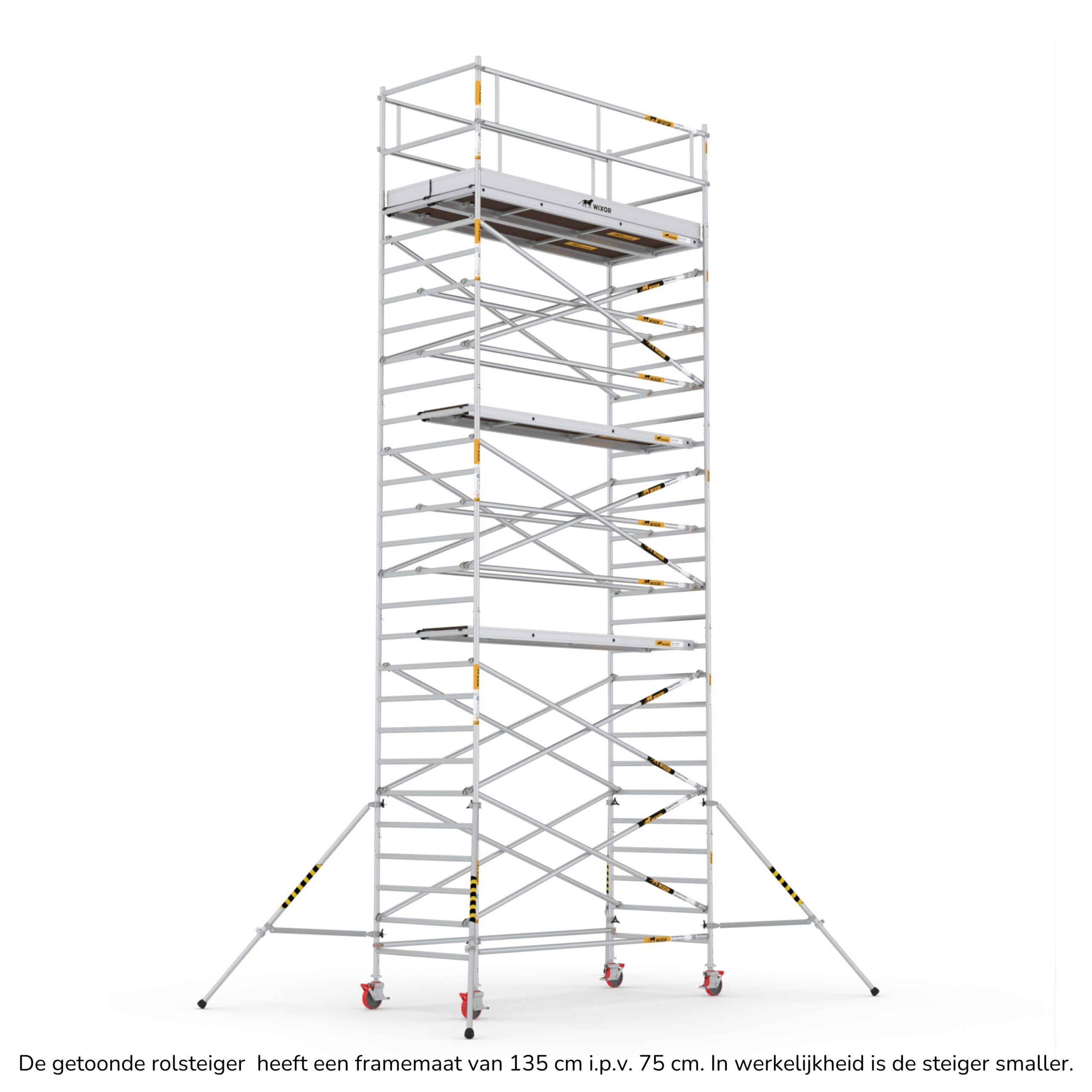 De breedte van deze rolsteiger is 75cm en het werkplatform is voorzien van één platform van 60cm breed, wat ideaal is voor gebruik in smalle ruimtes.