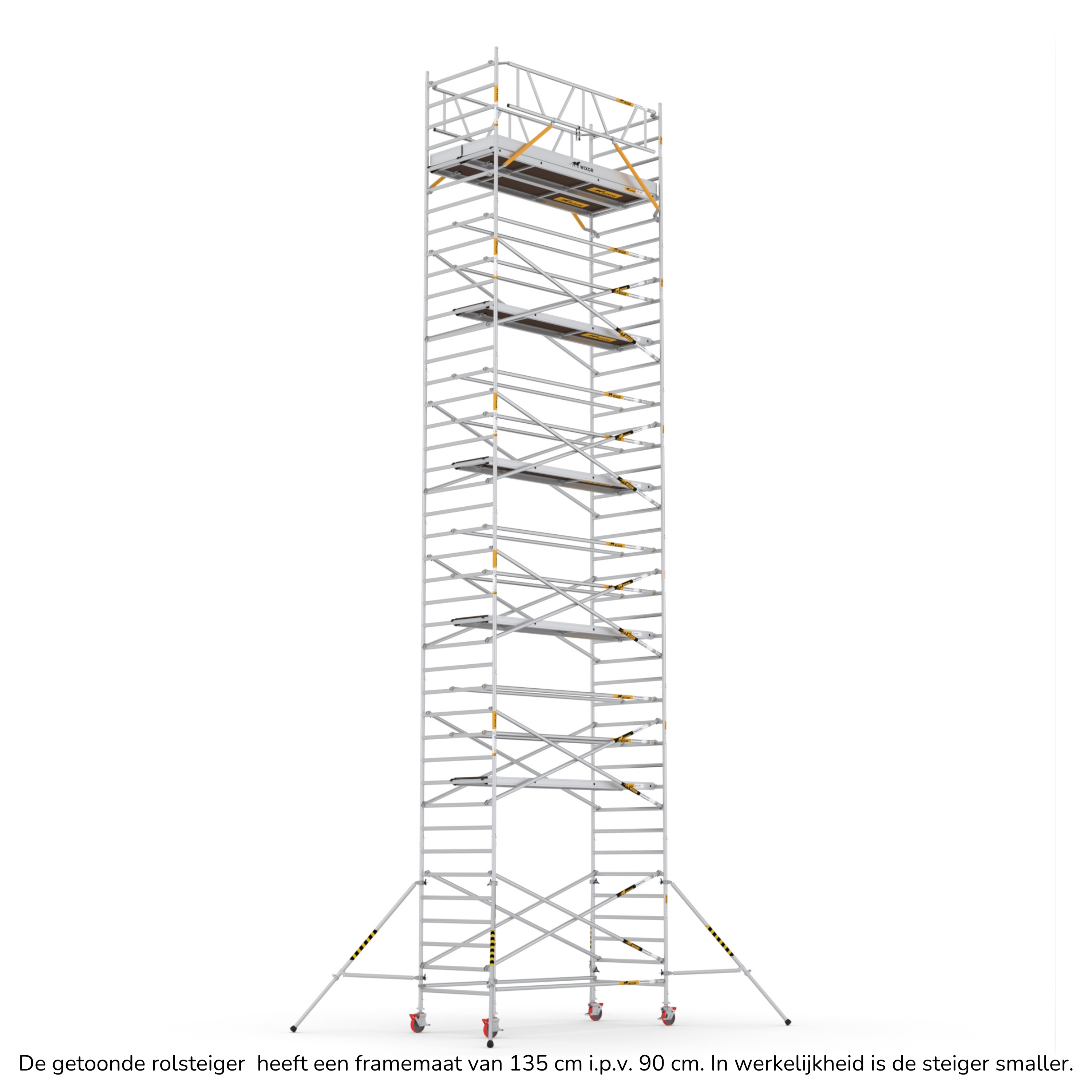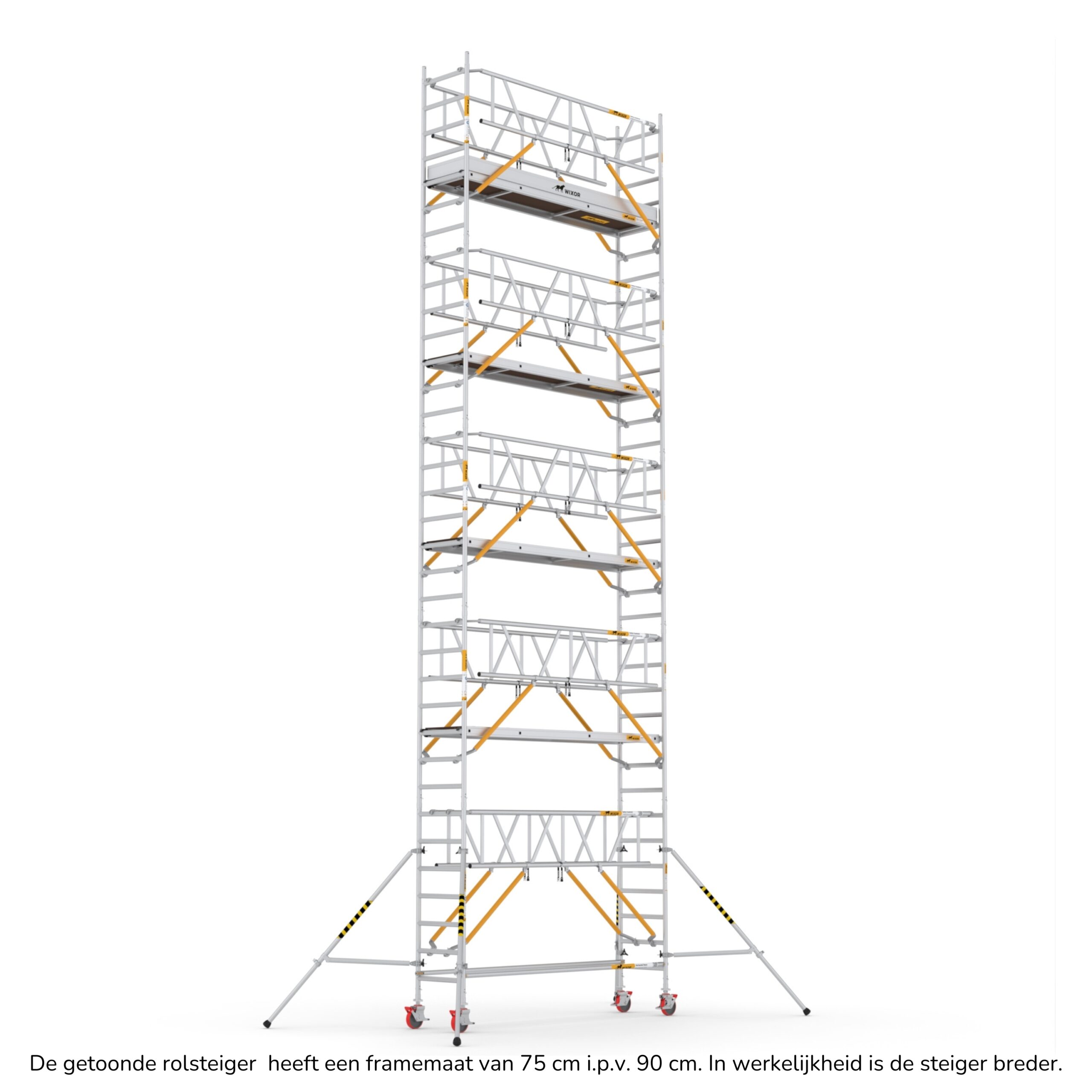 De breedte van deze rolsteiger is 90cm en het werkplatform is voorzien van één platform van 60cm breed, wat ideaal is voor gebruik in smalle ruimtes.